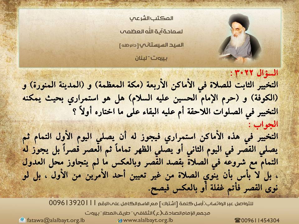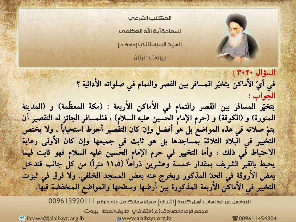 يتخيّر المسافر بين القصر والتمام في الأماكن الأربعة : (مكة المعظّمة) و (المدينة المنورة) و (الكوفة) و (حرم الإمام الحسين عليه السلام) ، فللمسافر الجائز له التقصير أن يتمّ صلاته في هذه المواضع بل هو أفضل وإن كان التقصير أحوط استحباباً ، ولا يختص التخيير في البلاد الثلاثة بمساجدها بل هو ثابت في جميعها وإن كان الأولى رعاية الاحتياط في ذلك ، وأما التخيير في حرم الإمام الحسين عليه السلام فهو ثابت فيما يحيط بالقبر الشريف بمقدار خمسة وعشرين ذراعاً (11,5 متراً) من كل جانب فتدخل بعض الأروقة في الحدّ المذكور ويخرج عنه بعض المسجد الخلفي. ولا فرق في ثبوت التخيير في الأماكن الأربعة المذكورة بين أرضها وسطحها والمواضع المنخفضة فيها.