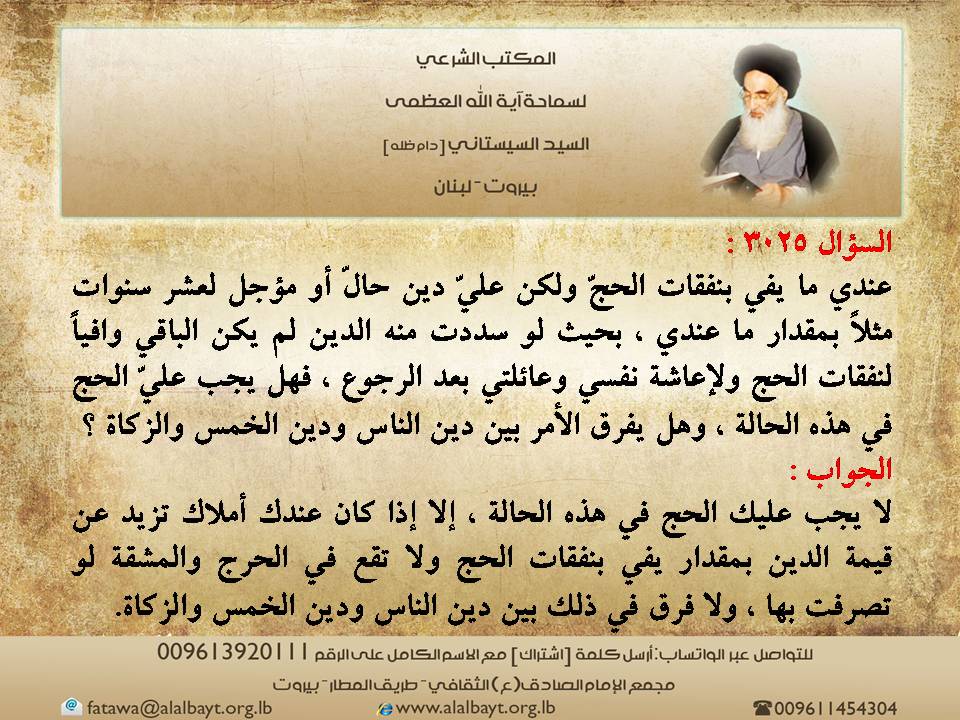 عندي ما يفي بنفقات الحجّ ، ولكن عليّ دَين حالّ أو مؤجّل لعشر سنوات مثلاً بمقدار ما معي ، بحيث لو سدّدت منه الدَّين لم يكن الباقي وافياً لنفقات الحج ولإعاشة نفسي وعائلتي بعد الرجوع ، فهل يجب عليّ الحج في هذه الحالة ، وهل يفرق الأمر بين دَين الناس ودَين الخمس والزكاة ؟