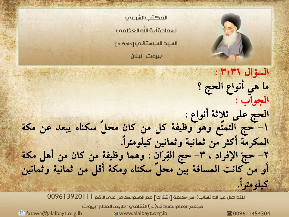 1- حج التمتّع وهو وظيفة كل من كان محلّ سكناه يبعد عن مكة المكرمة أكثر من ثمانية وثمانين كيلومتراً.